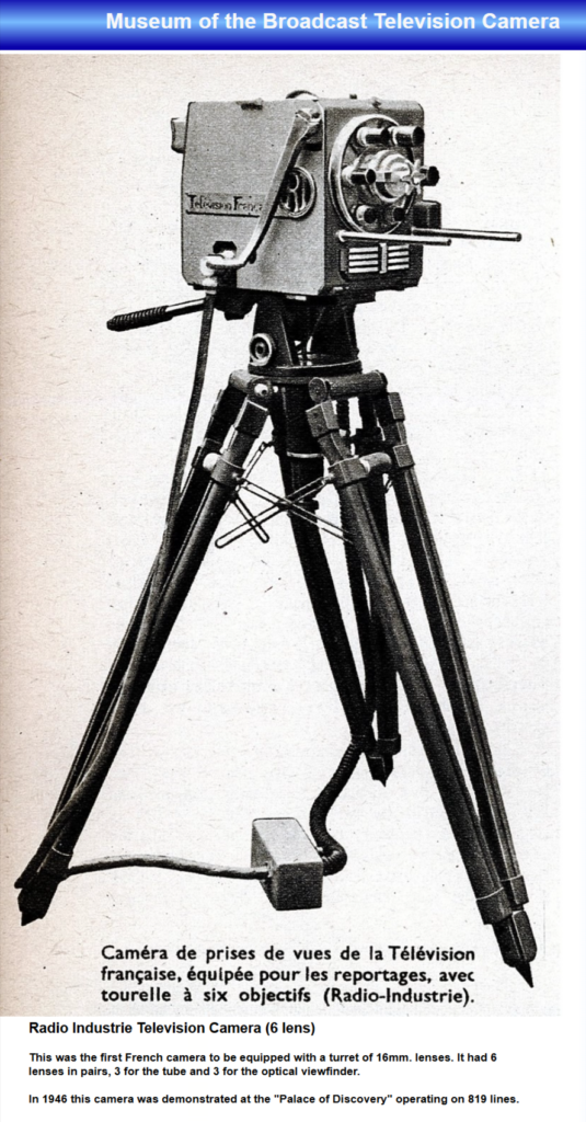 It was made for RTF Television Service (now TF1), and since we don’t have documentation on what kind of tube was used, two things tell me it was an Iconoscope camera. First, the date as Image Orthicons were not in service yet, and second…since it has an optical viewfinder and a turret that has 6 lenses…3 longer ones for the tube and 3 short ones for the viewfinder image, this has to be an Iconoscope camera.Â